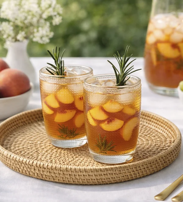 Refresca tus momentos con el té frío de durazno y romero, servido en vasos MARIEL-VC que realzan color, aroma y elegancia.
