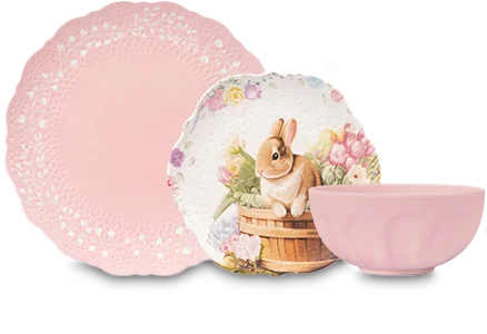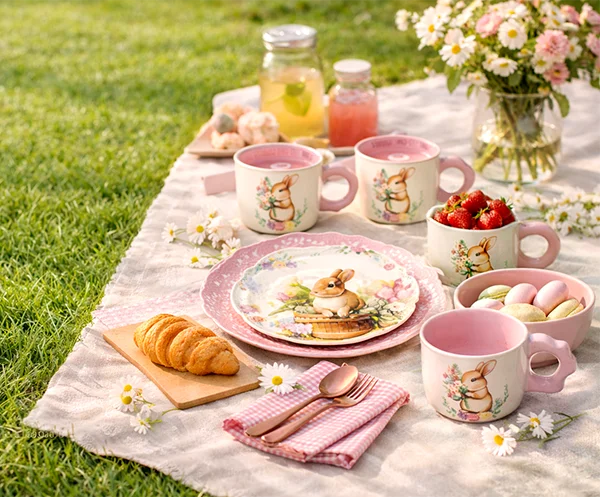 4. Sirve las fresas y los mini pastelitos en tu vajilla PINKBUNNY-D. Acompaña con café o té servido en las tazas PINKBUNNY.